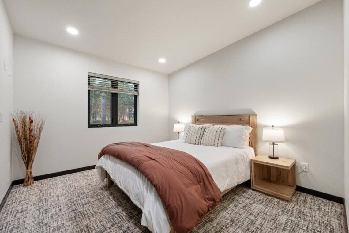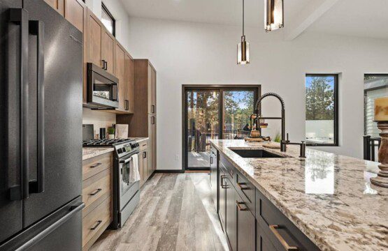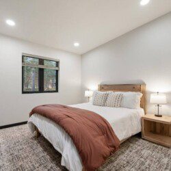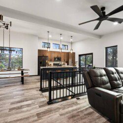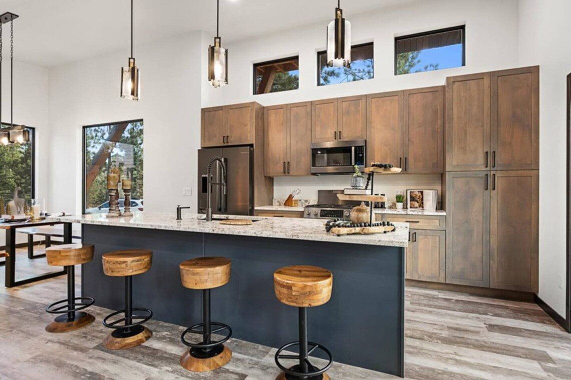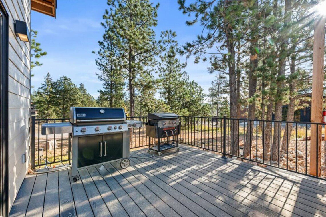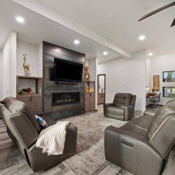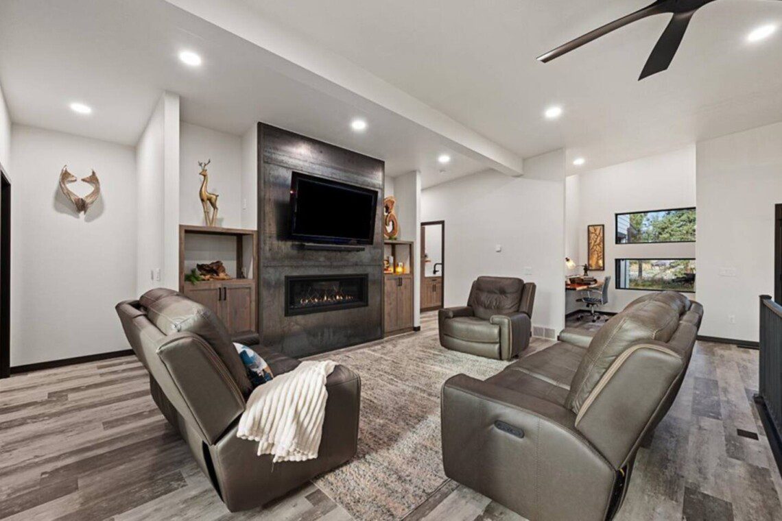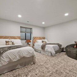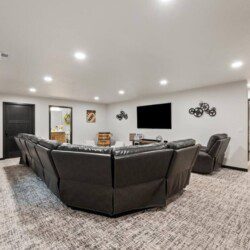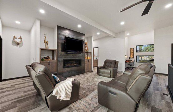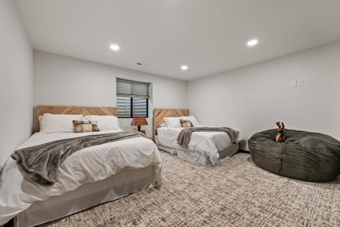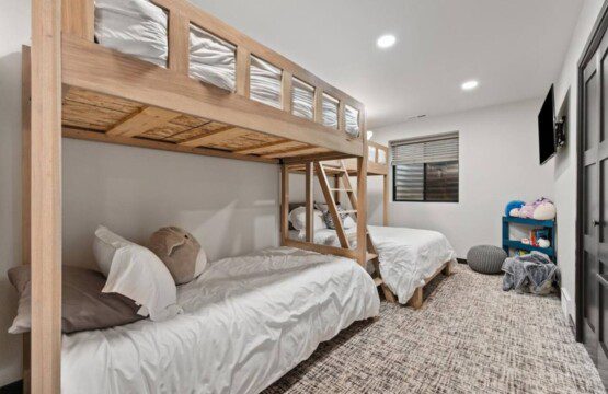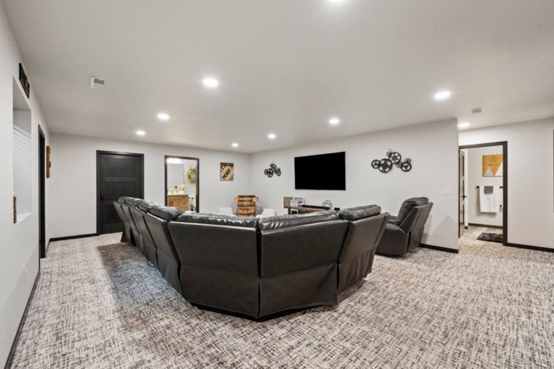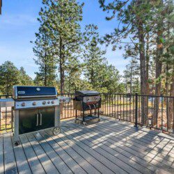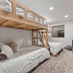 Inside, the open-concept main level features a spacious living room with plush seating, a stone fireplace, and large windows that frame the surrounding pines. The fully equipped kitchen and dining area make it easy to cook and share meals together. The main level also includes a master suite with a private ensuite bathroom, a second bedroom and full guest bath, and access to a three-car garage. Downstairs, the walk-out basement offers a second living area with cozy seating, a large TV, and a custom barrel arcade game that’s sure to bring out everyone’s competitive side. You’ll also find a fun bunk room, two additional bedrooms, and two more full bathrooms, comfortably sleeping up to fifteen guests in total.