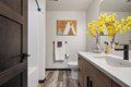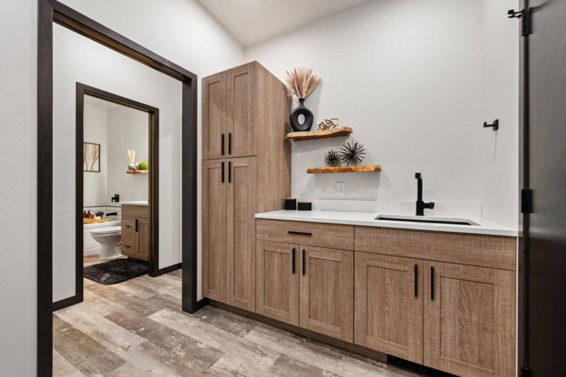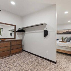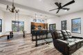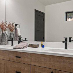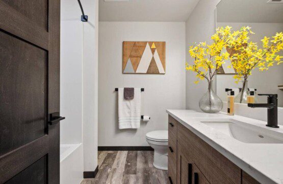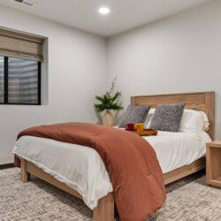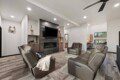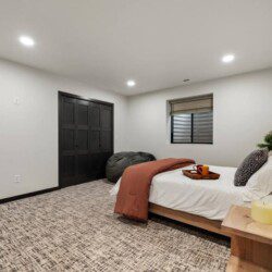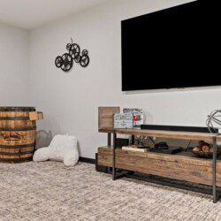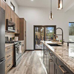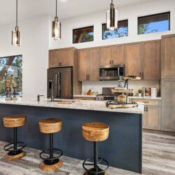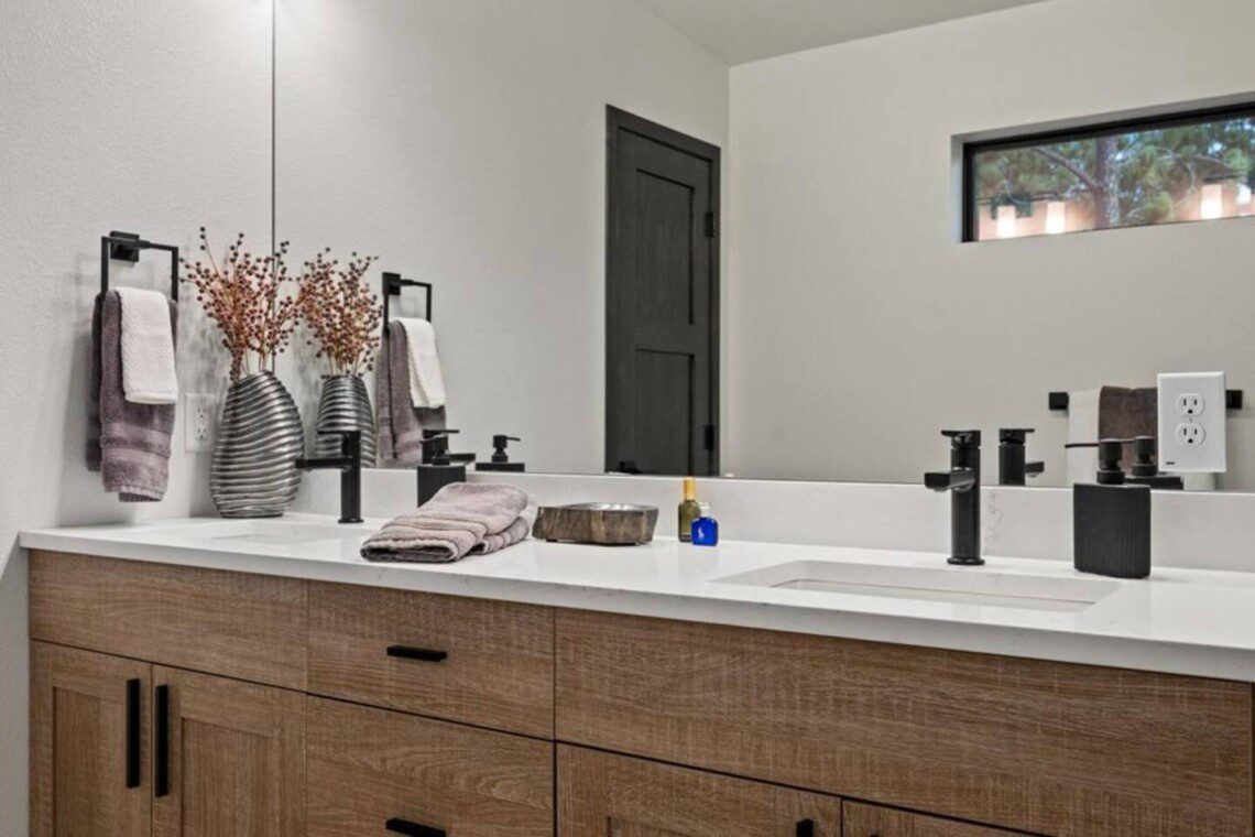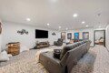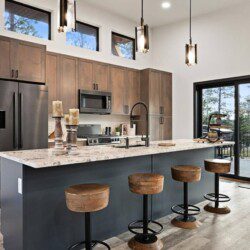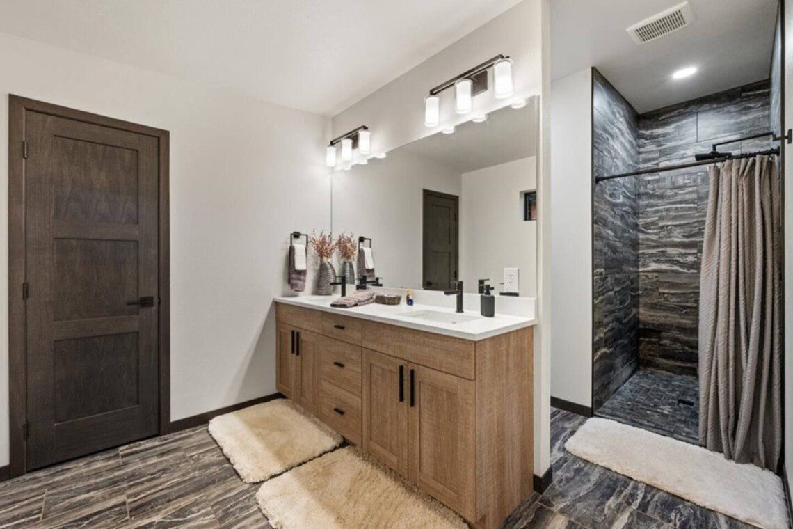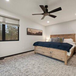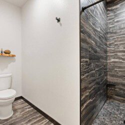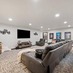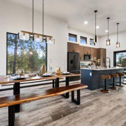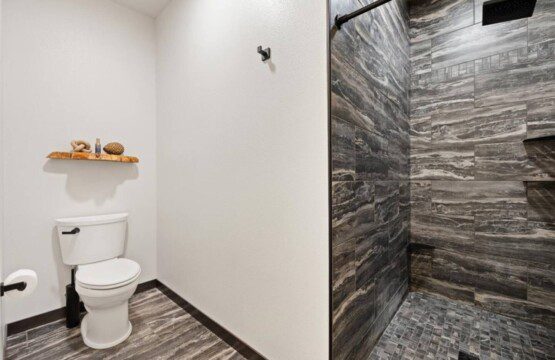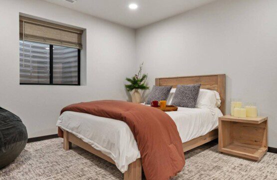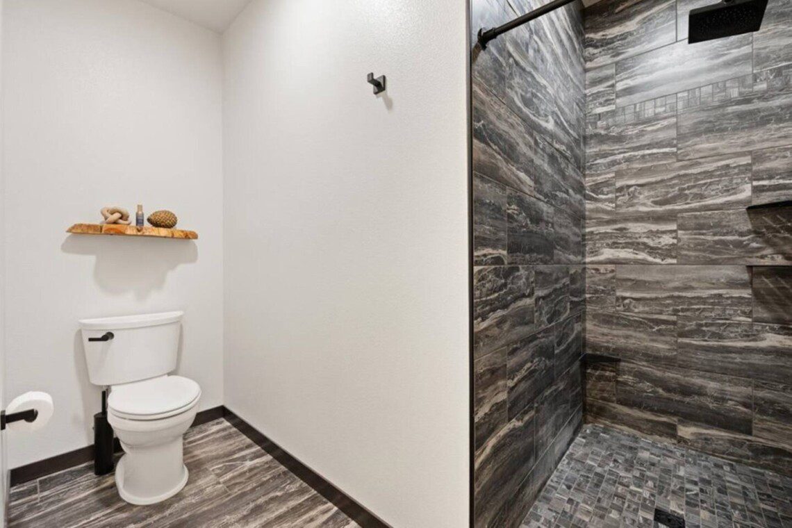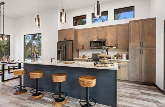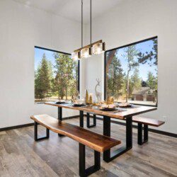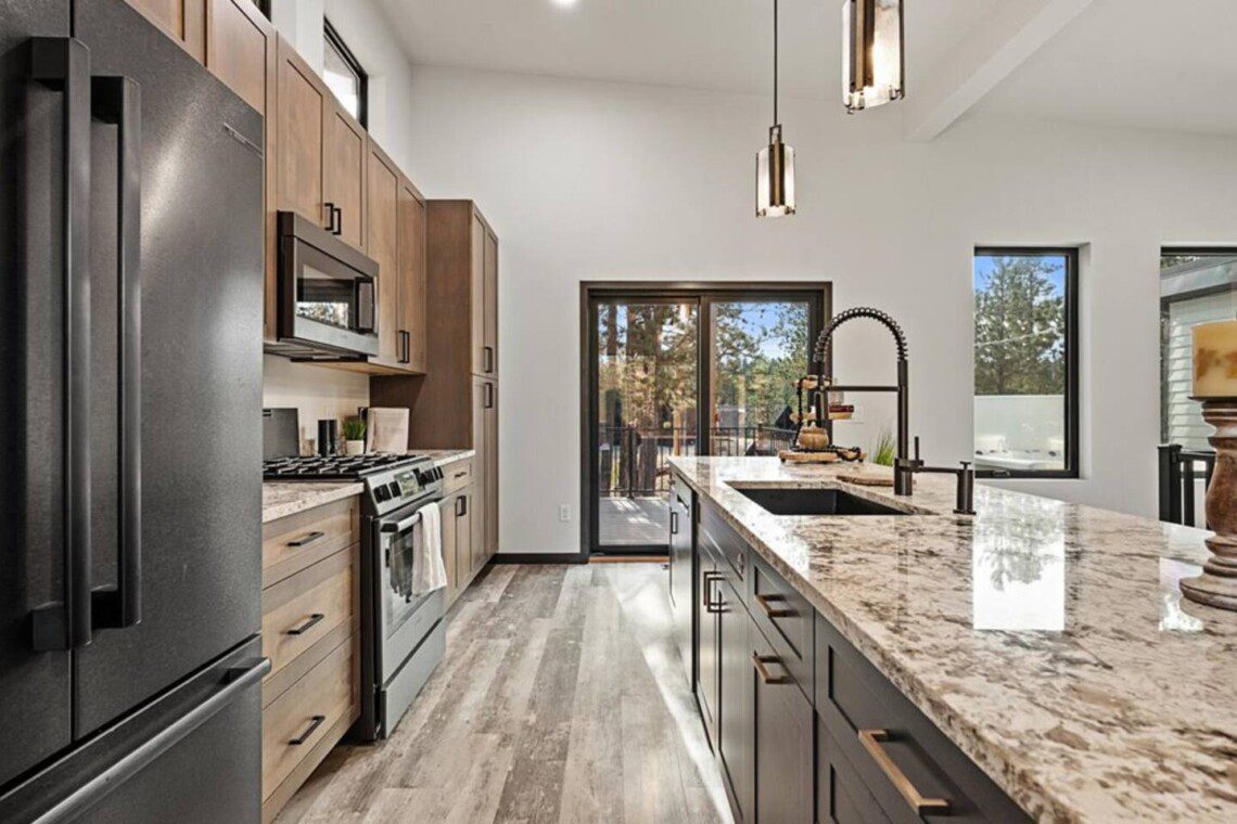 Inside, the open-concept main level features a spacious living room with plush seating, a stone fireplace, and large windows that frame the surrounding pines. The fully equipped kitchen and dining area make it easy to cook and share meals together. The main level also includes a master suite with a private ensuite bathroom, a second bedroom and full guest bath, and access to a three-car garage. Downstairs, the walk-out basement offers a second living area with cozy seating, a large TV, and a custom barrel arcade game that’s sure to bring out everyone’s competitive side. You’ll also find a fun bunk room, two additional bedrooms, and two more full bathrooms, comfortably sleeping up to fifteen guests in total.