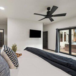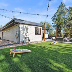 Step outside and experience what gives Fireside Nights its name. The backyard is a warm, glowing retreat featuring a private hot tub under the stars, a fire table with seating for eight, a Blackstone grill and traditional grill for outdoor cooking, and a grassy area perfect for cornhole and yard games. Overhead, soft string lights cast a cozy glow that ties the entire space together — the perfect setting for long conversations, laughter, and late-night memories.
