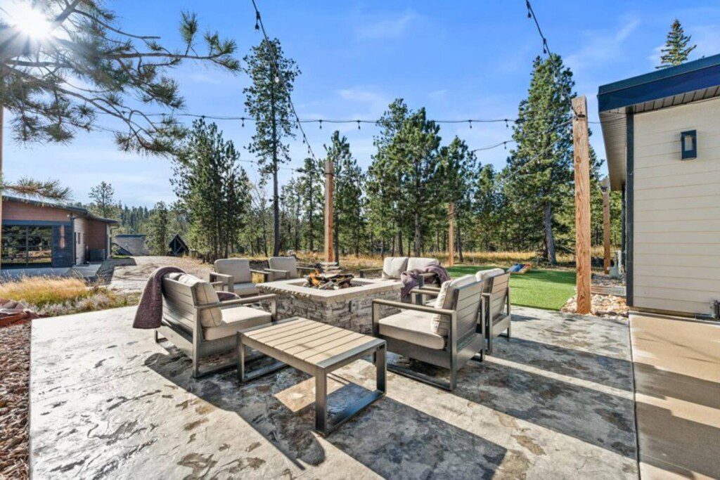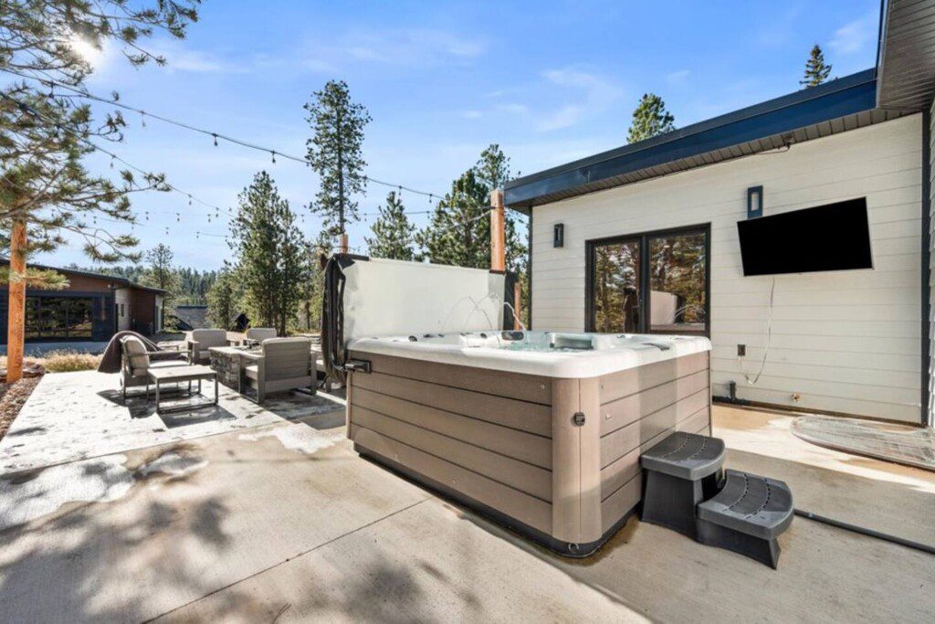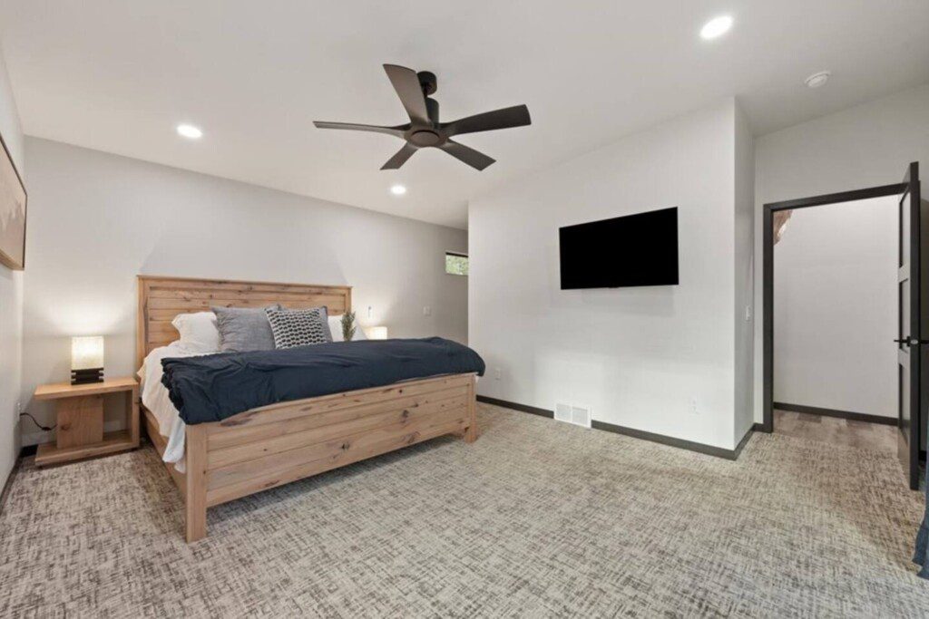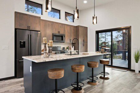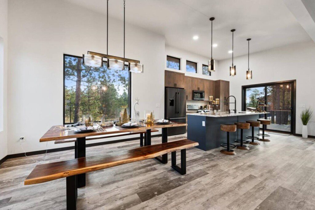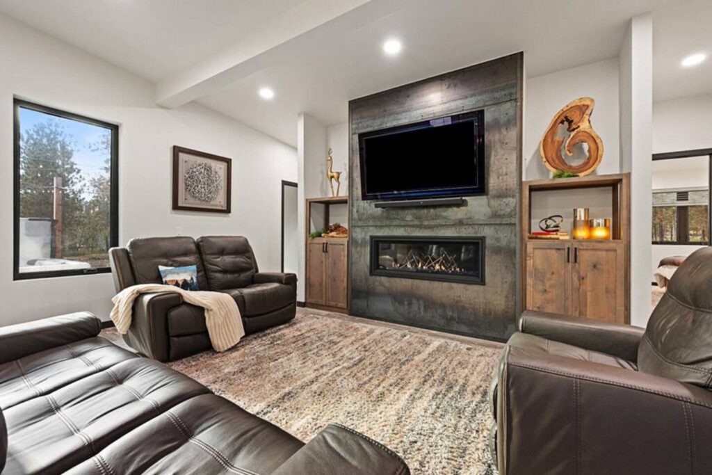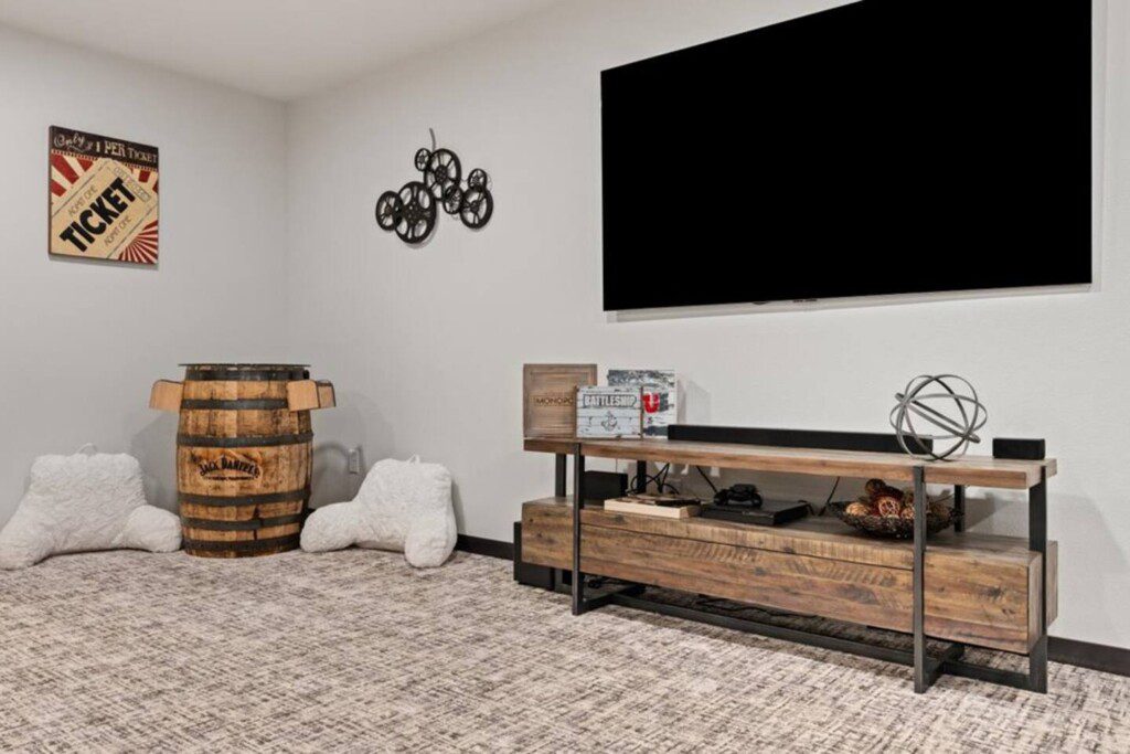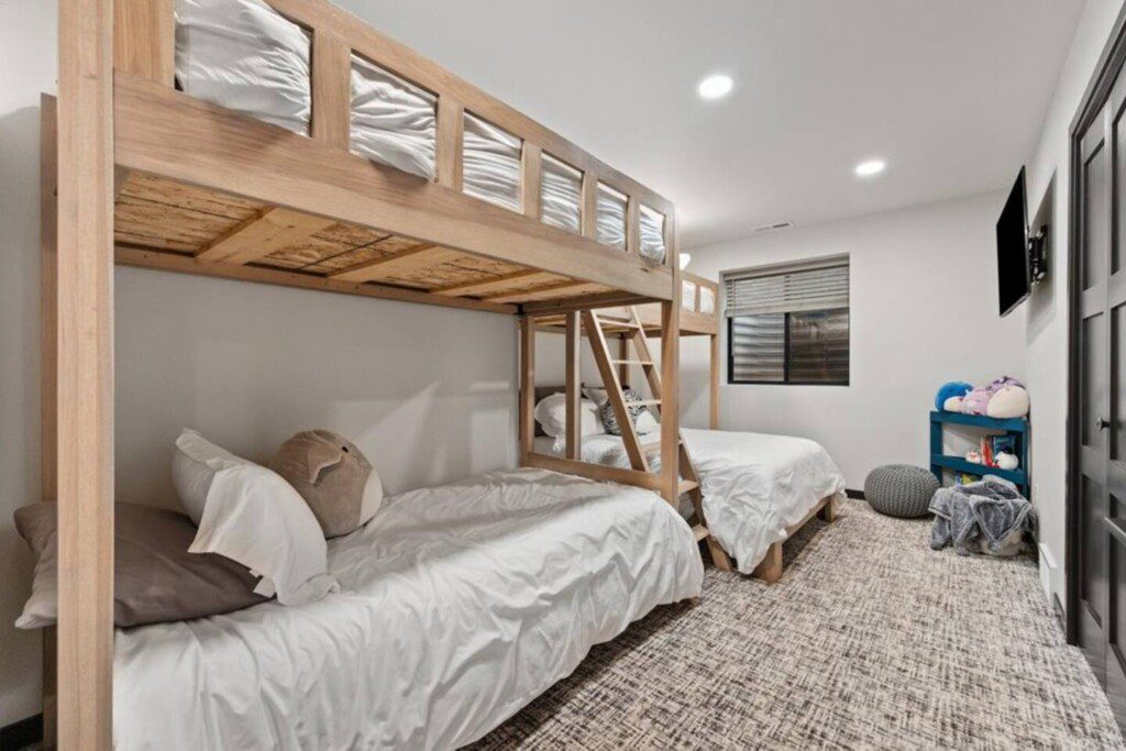 Inside, the open-concept main level features a spacious living room with plush seating, a stone fireplace, and large windows that frame the surrounding pines. The fully equipped kitchen and dining area make it easy to cook and share meals together. The main level also includes a master suite with a private ensuite bathroom, a second bedroom and full guest bath, and access to a three-car garage. Downstairs, the walk-out basement offers a second living area with cozy seating, a large TV, and a custom barrel arcade game that’s sure to bring out everyone’s competitive side. You’ll also find a fun bunk room, two additional bedrooms, and two more full bathrooms, comfortably sleeping up to fifteen guests in total.