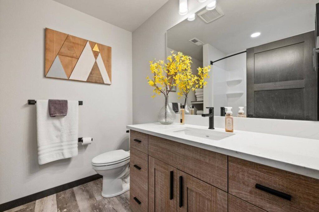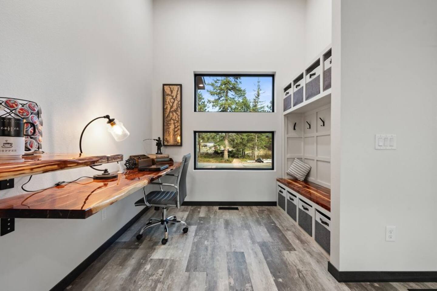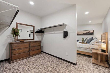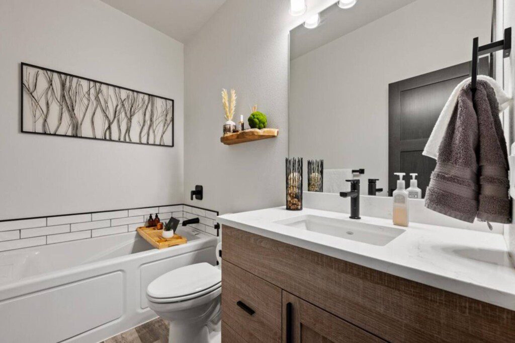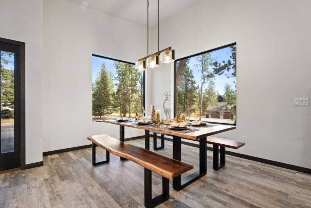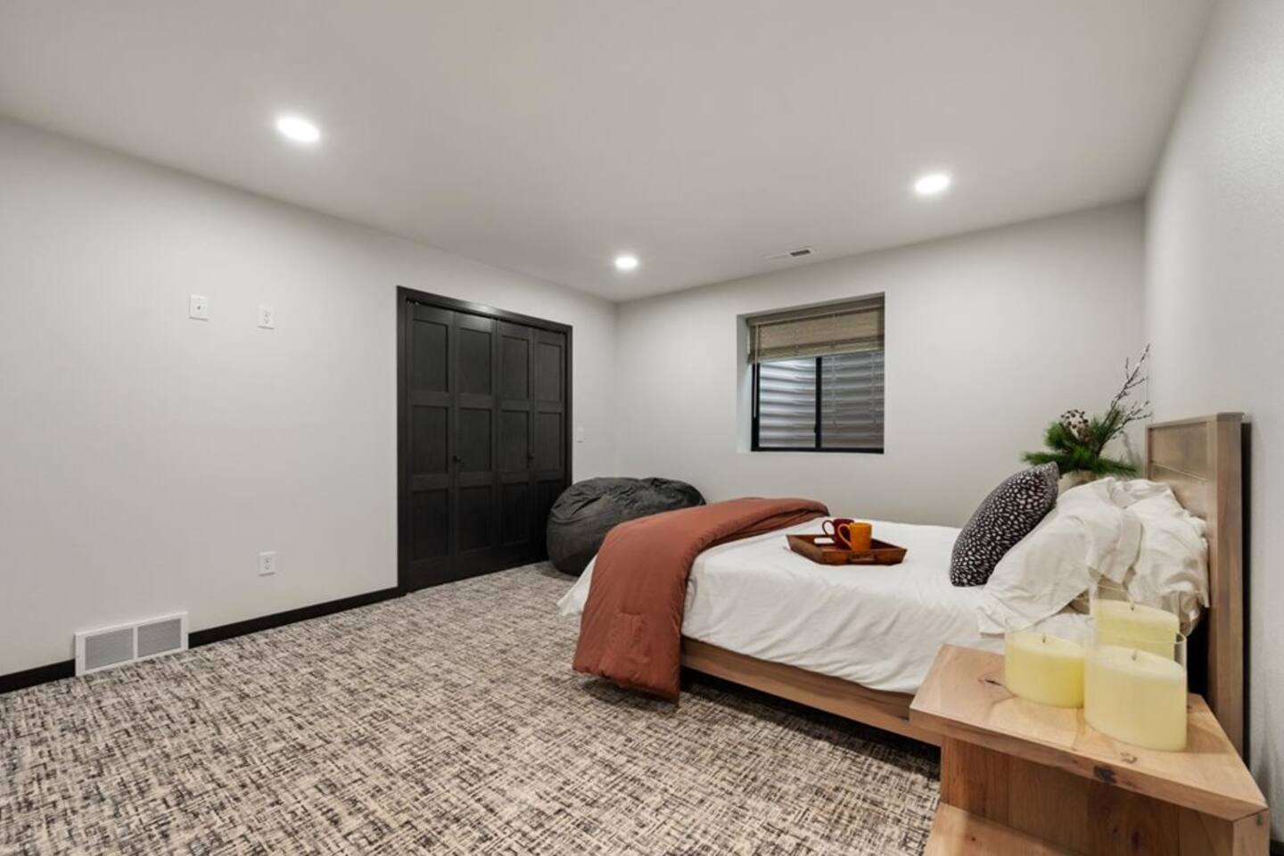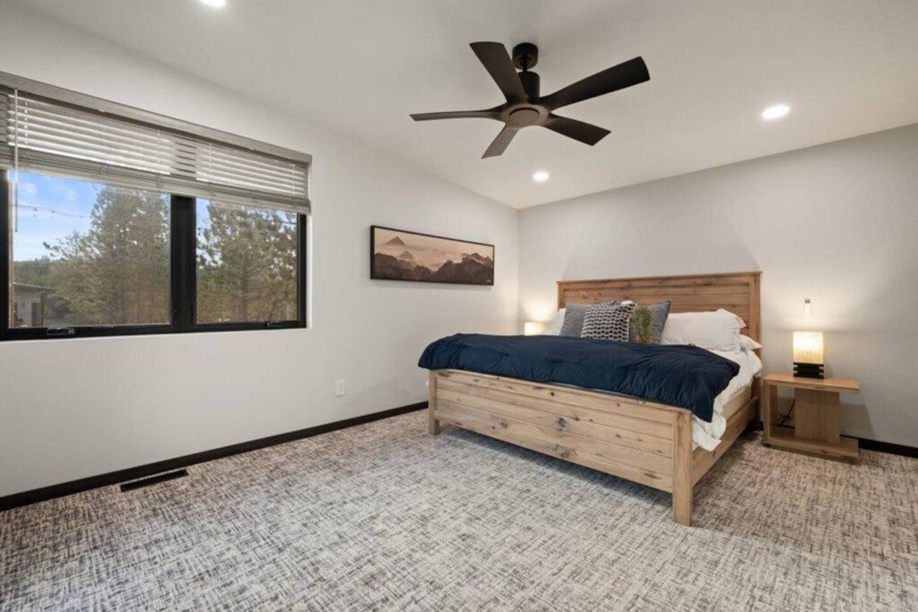 Inside, the open-concept main level features a spacious living room with plush seating, a stone fireplace, and large windows that frame the surrounding pines. The fully equipped kitchen and dining area make it easy to cook and share meals together. The main level also includes a master suite with a private ensuite bathroom, a second bedroom and full guest bath, and access to a three-car garage. Downstairs, the walk-out basement offers a second living area with cozy seating, a large TV, and a custom barrel arcade game that’s sure to bring out everyone’s competitive side. You’ll also find a fun bunk room, two additional bedrooms, and two more full bathrooms, comfortably sleeping up to fifteen guests in total.